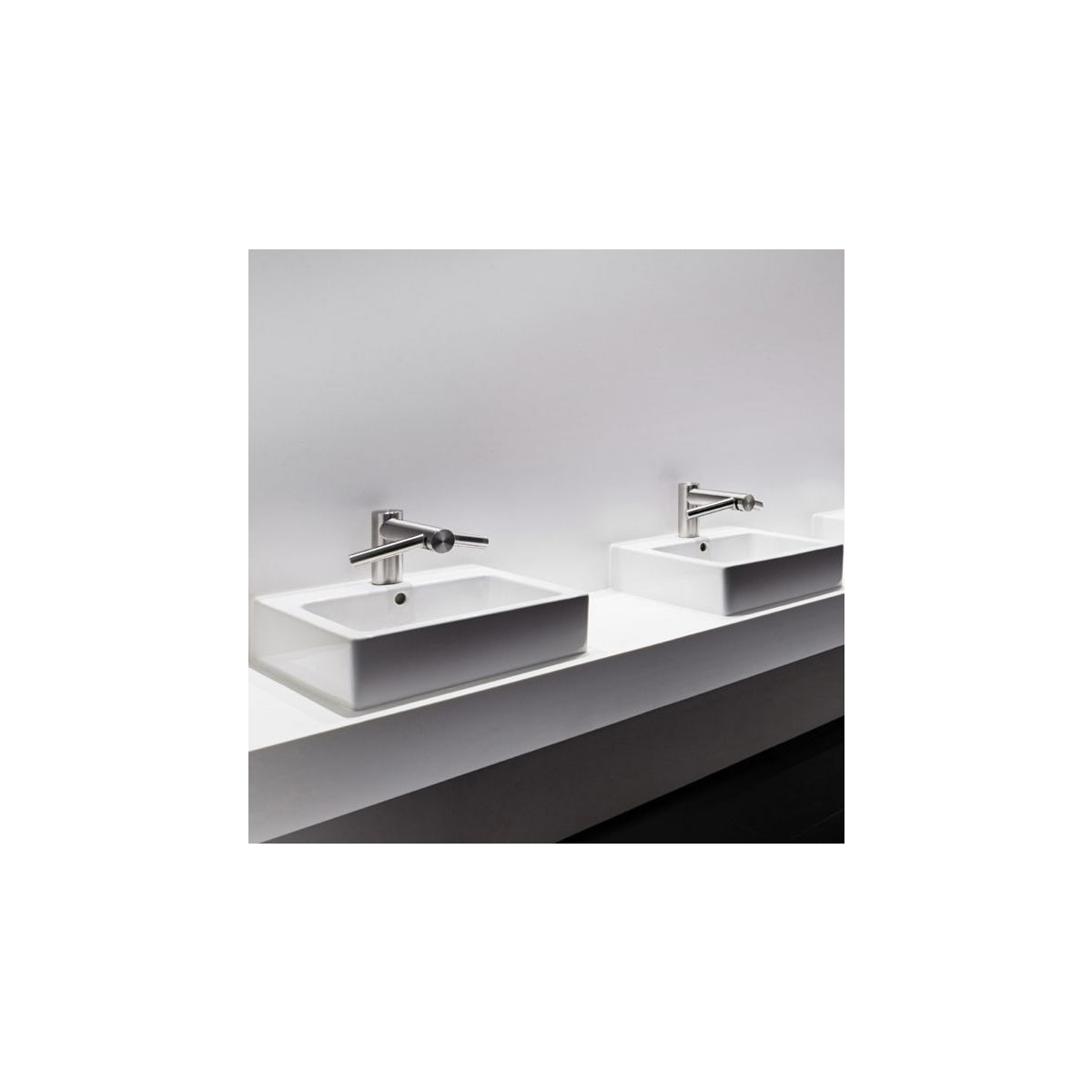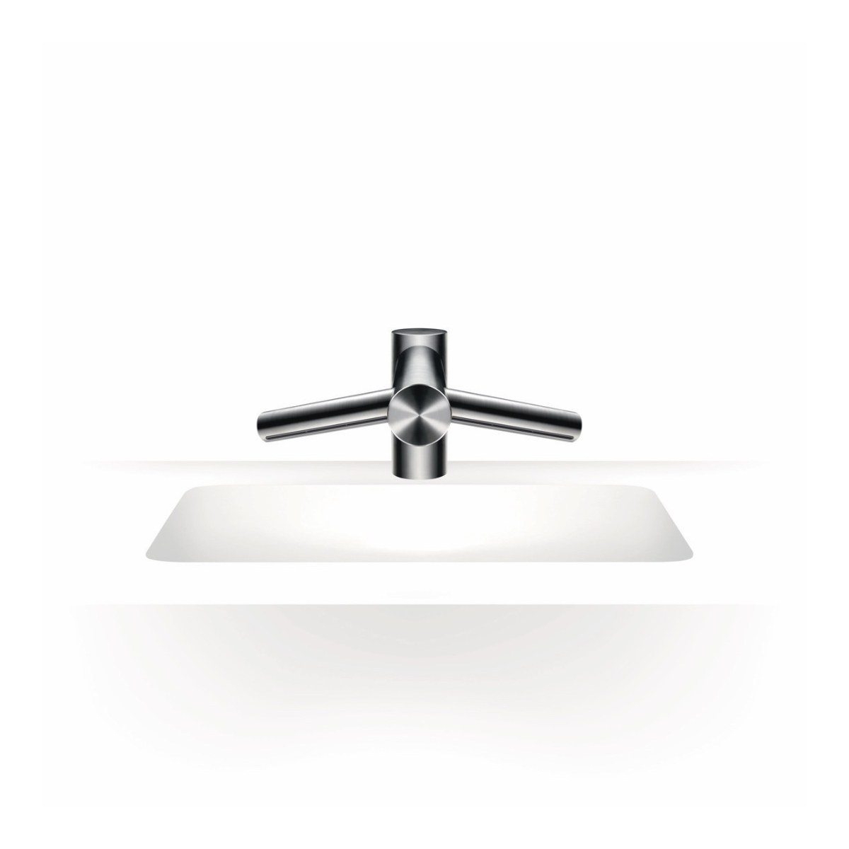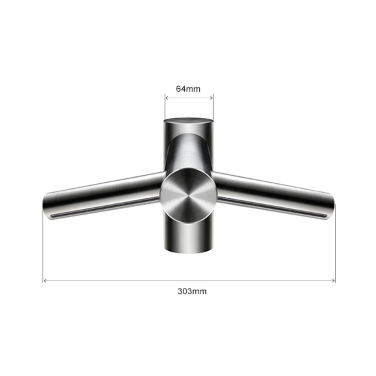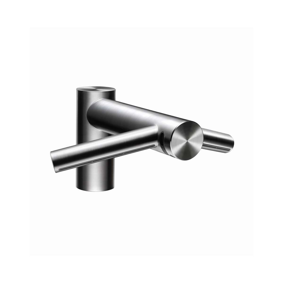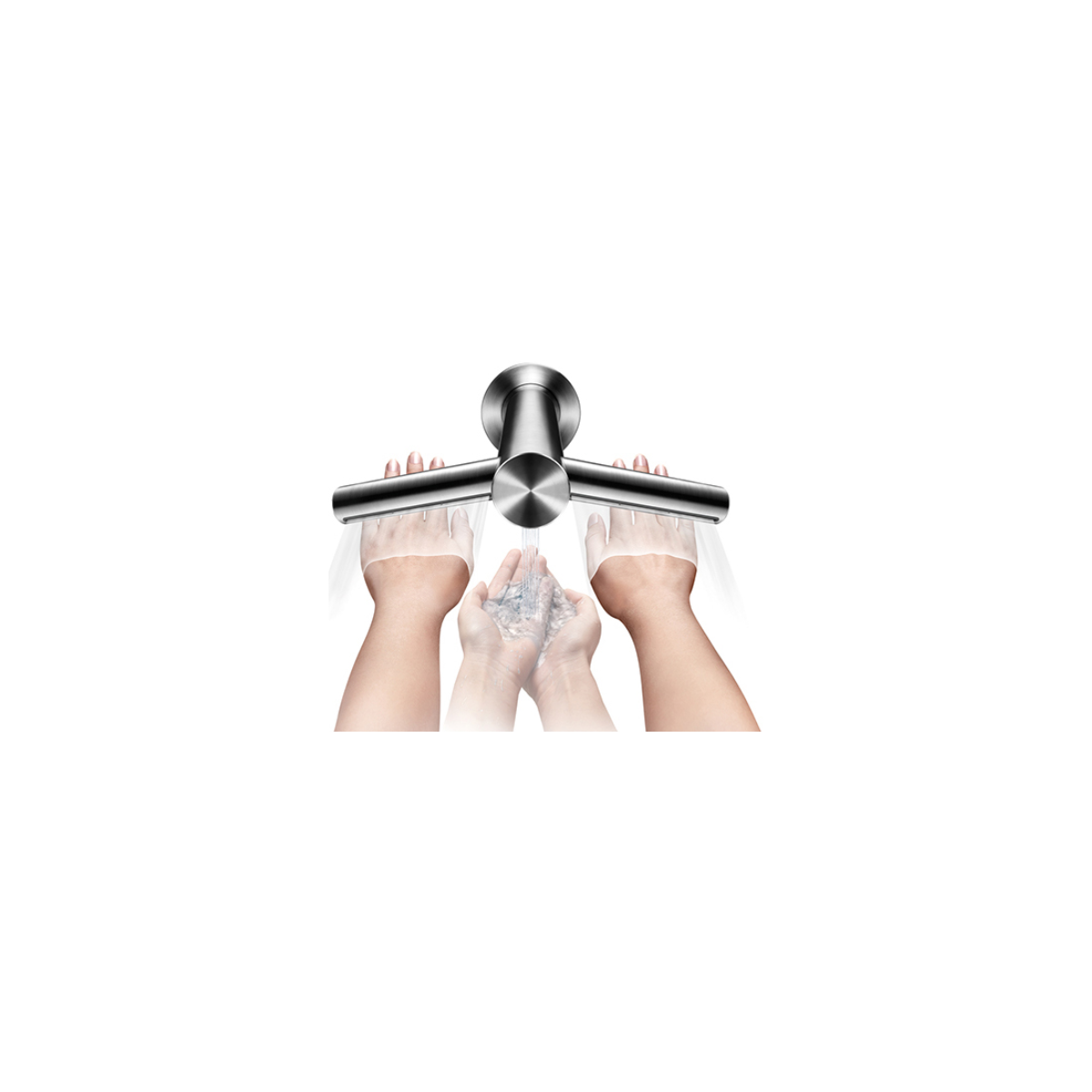 Сушилка для рук Dyson Airblade Wash+Dry интегрирована в смеситель. Подача воды, воздуха осуществляется над раковиной из смесителя. Нет необходимости в организации отдельной зоны для высушивания рук.